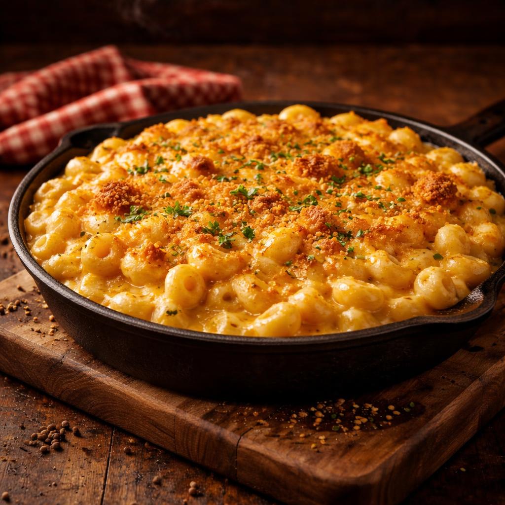 Creamy three-cheese mac with a crispy golden breadcrumb crust, baked to perfection