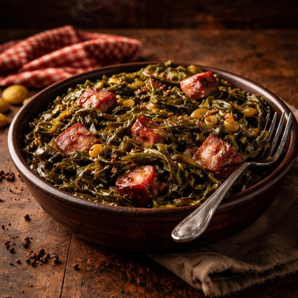 Southern-style collard greens slow-cooked with smoked ham hock, onions, and a touch of vinegar
