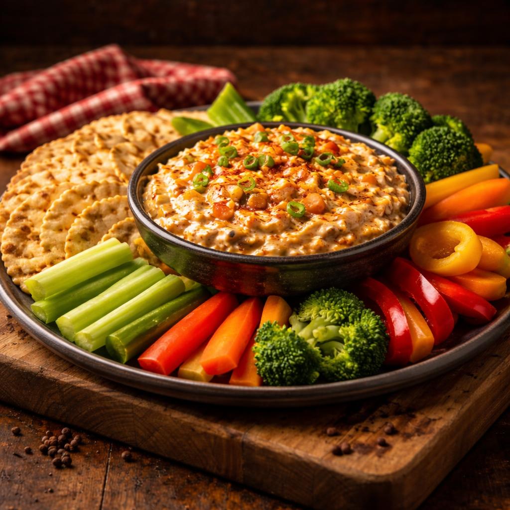 Southern-style pimento cheese with a smoky kick, served warm with house-baked crackers and fresh vegetables