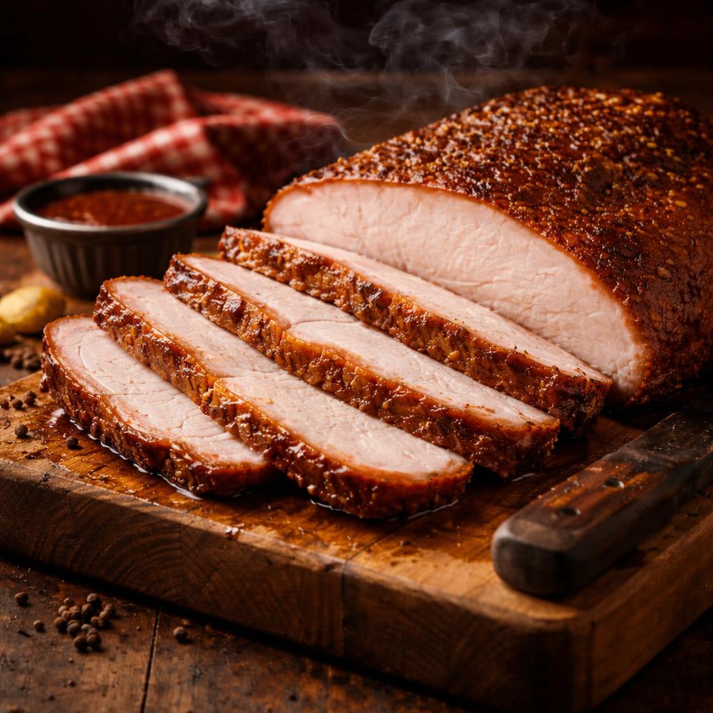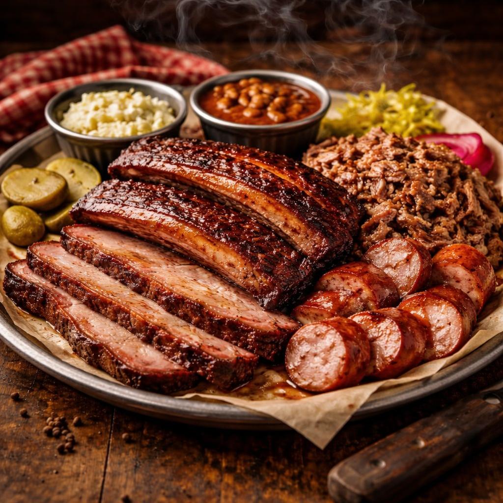 Texas-style beef brisket rubbed with our secret spice blend, smoked for 14 hours over oak wood until it has a perfect pink smoke ring and bark