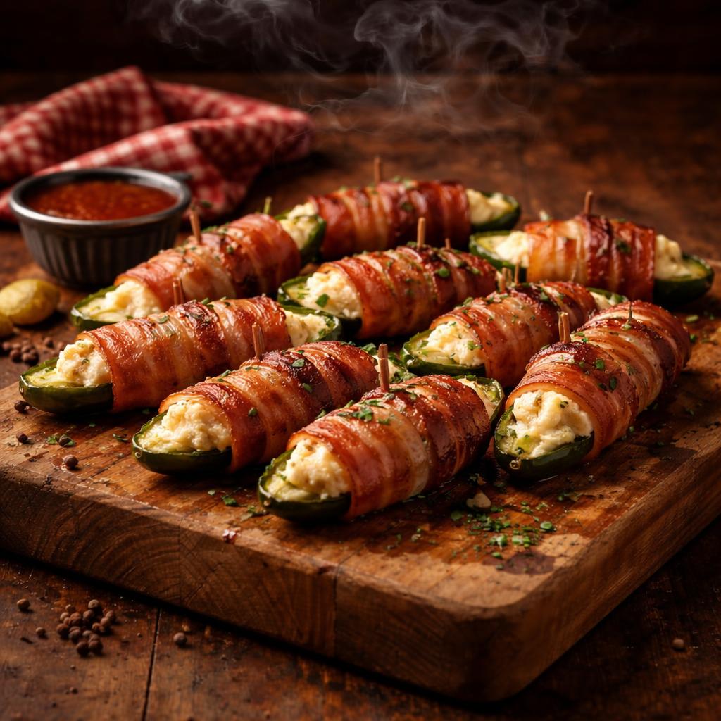 Smoked jalapeños stuffed with cream cheese and wrapped in thick-cut bacon, finished on the grill until crispy